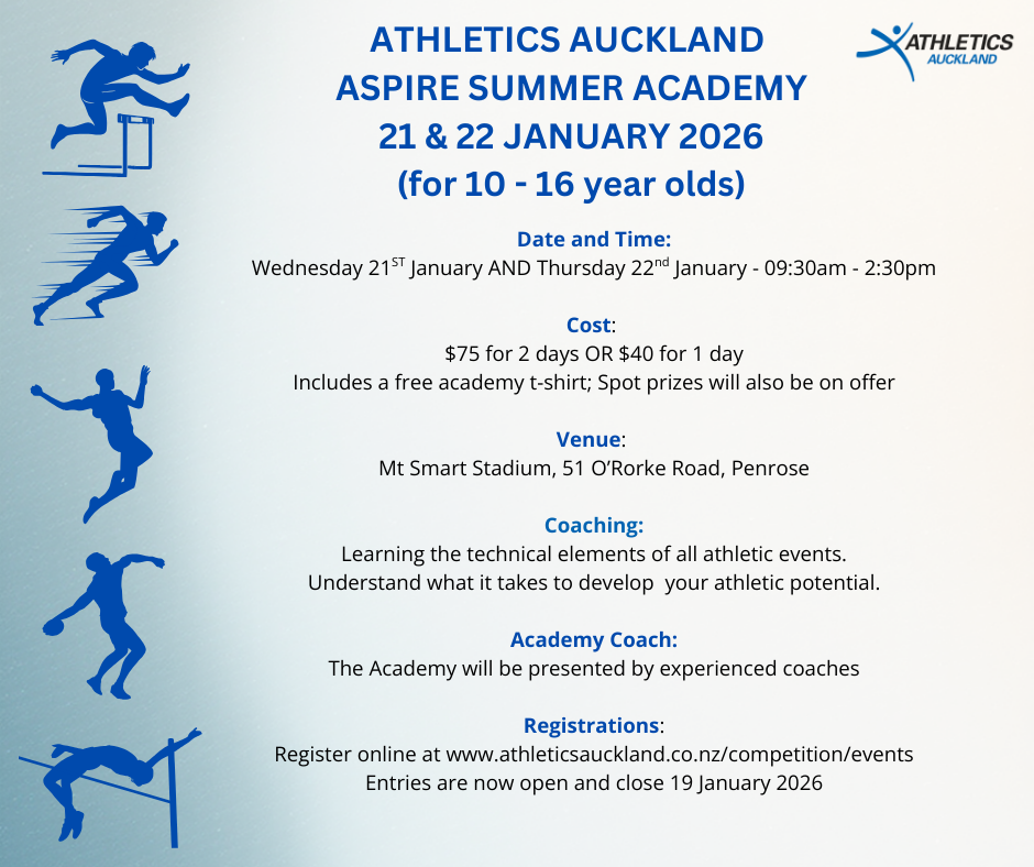 Venue: #2 Arena Mt Smart, 51 O’Rorke Road, Penrose Athletics Auckland Aspire Summer Academy for 10 – 16 year old’s. Learn the techniques required to develop your athleticism. All disciplines covered