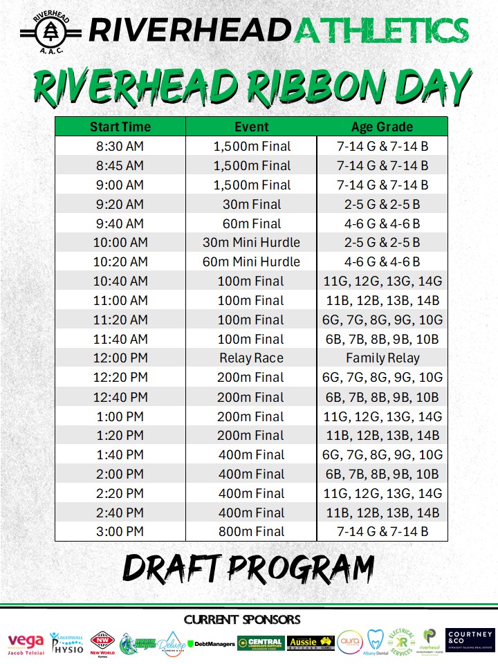 Riverhead Athletics would like to invite your club to attend our Riverhead Ribbon Day, being held on Saturday 17 January 2026.