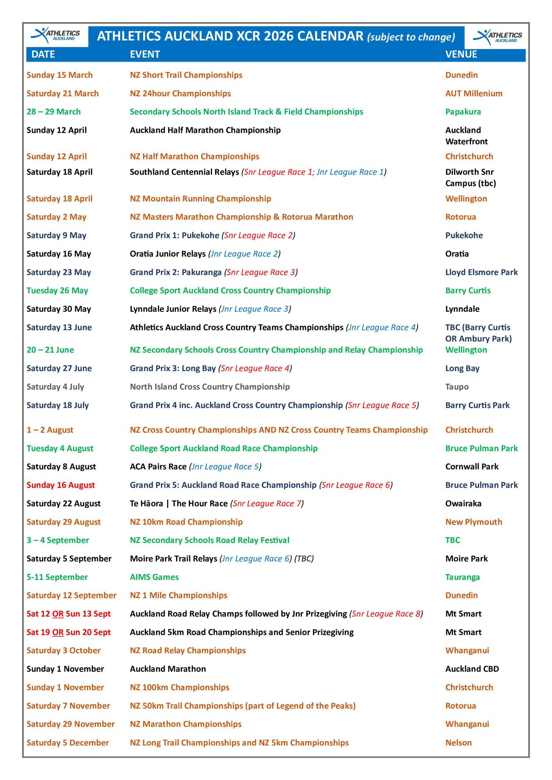 - NZ Cross Country Championship: 1st & 2nd August 2026 – Hagley Park, Christchurch